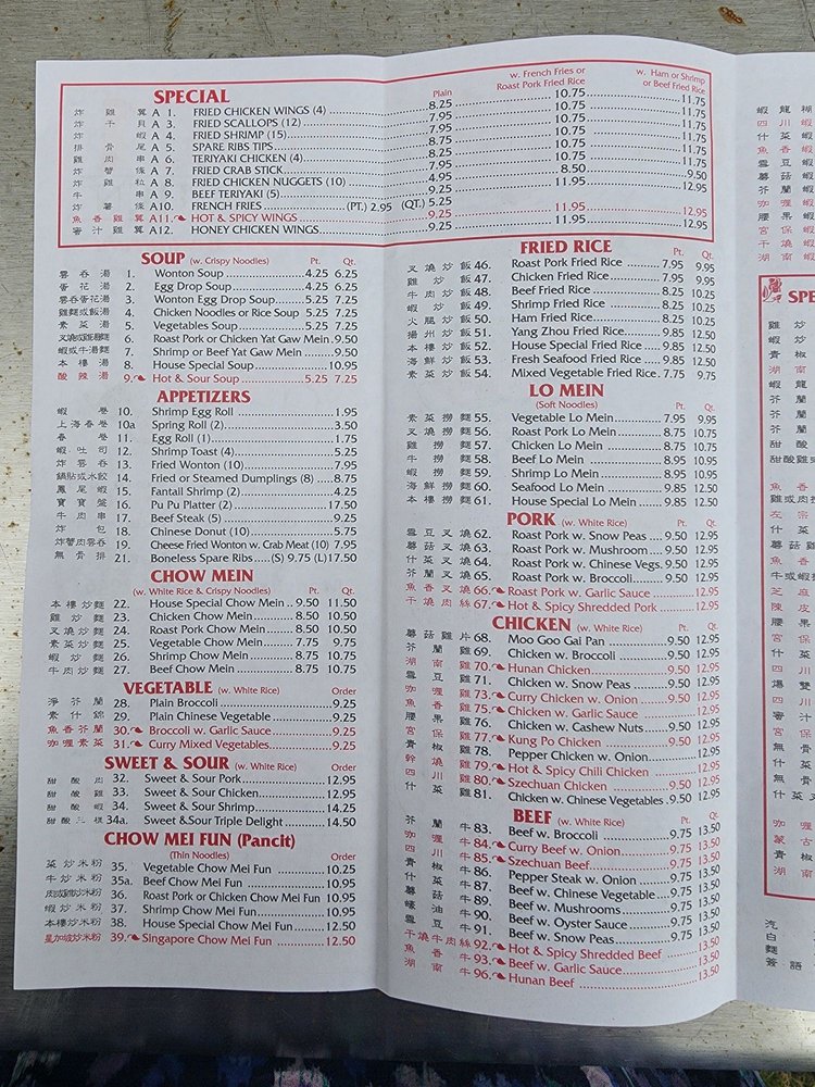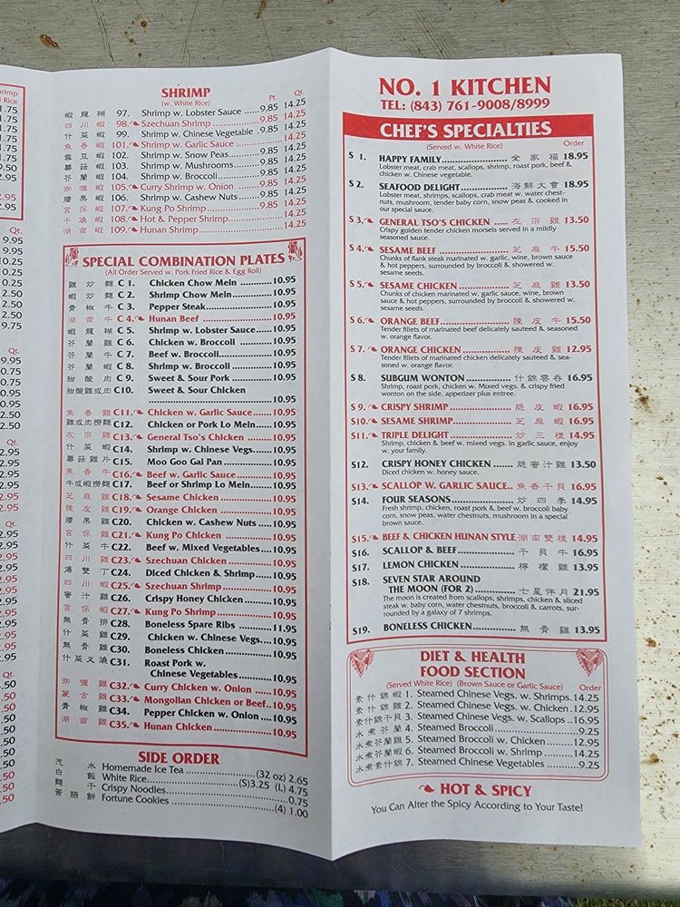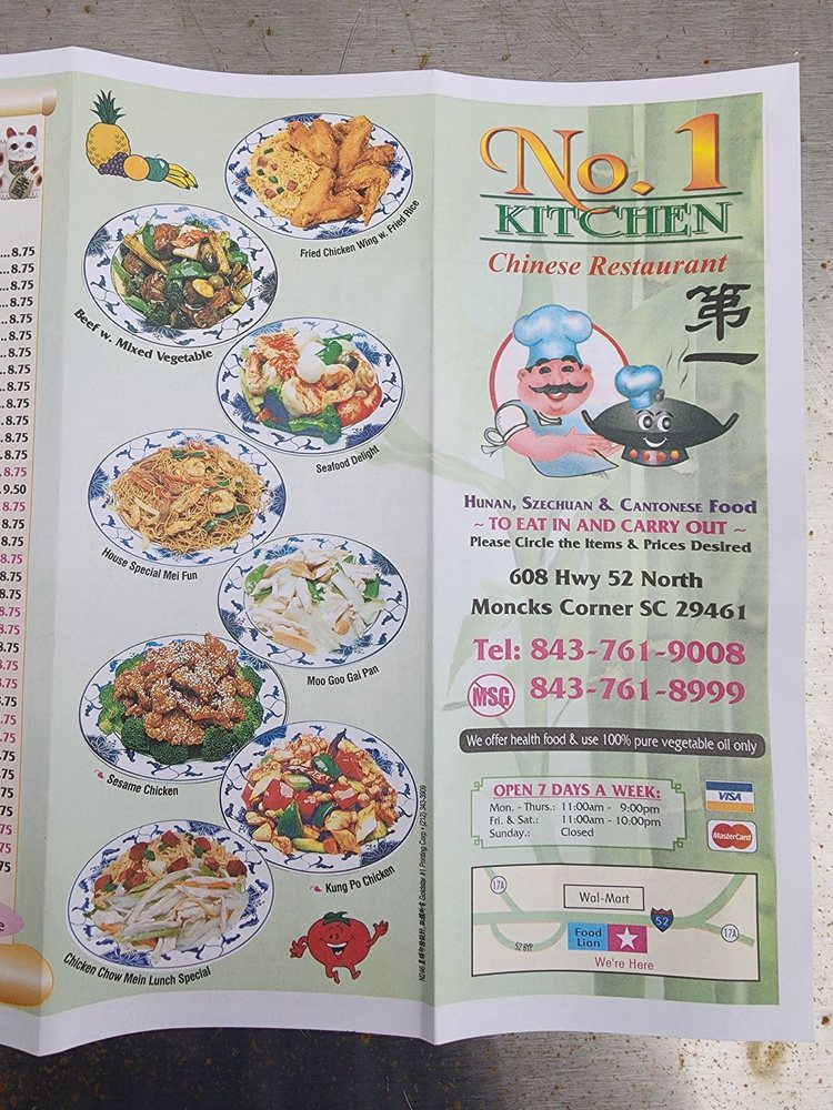 Introducing the menu at No 1 Kitchen, a Chinese restaurant in Moncks Corner, SC. Known for its family-owned charm and extensive menu options, No 1 Kitchen offers a variety of appetizers like Roast Pork Egg Rolls, Fantail Shrimp, and Pu Pu Platters. Their soups range from classic Egg Drop Soup to Seafood Soup, satisfying a range of cravings. Chow Mein options include Chicken, Pork, and even Lobster variations. Customers rave about the delicious food, prompt service, and friendly staff. Reviews highlight the clean flavors, generous portions, and consistent quality of the dishes. No 1 Kitchen stands out for its affordability, fresh ingredients, and accommodating vegetarian options. With both delivery and takeout services available, this restaurant caters to a diverse range of preferences. Visit No 1 Kitchen for a taste of authentic Chinese cuisine in the heart of Moncks Corner.